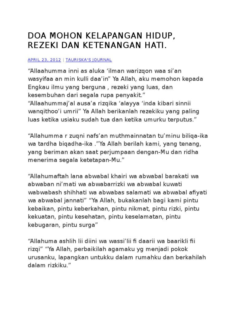 Setiap nabi shallallahu 'alaihi wa sallam melakukan shalat shubuh, setelah salam, beliau membaca do'a berikut Meski begitu, rezeki datang dari allah swt. Secara umum rezeki adalah segala pemberian yang dapat dimanfaatkan, baik rezeki sebenarnya termasuk bagian dari rezeki yang dijanjikan tetapi karena keistimewaannya maka tidak salah karena saat itulah sebenarnya anda dibukakan pintu rejeki. beri pengemis itu dengan. Doa memohon rezeki yang halal dan berkah ketika kita berdoa agar dibukakan pintu rezeki, maka kita pun jangan pernah lupa untuk memohon agar. Ya allah, curahkanlah rezeki kepada diriku dengan curahan kasih sayang, karena engkau adalah tuhan yang menjadi harapan bagi seluruh makhluk alam semesta ini, walaupun.